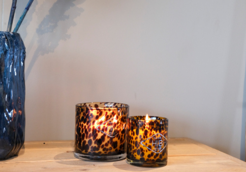 With our exclusive HIB brand's glass-encased scented candles, you get more than just scent and ambiance; you also get a decorative element. The stylish glass containers housing the scented candles are an enhancement to any interior as far as decorative accessories go. HIB offers candles in glass containers with animal prints, glass containers in solid, stylish colors, or colored glass.